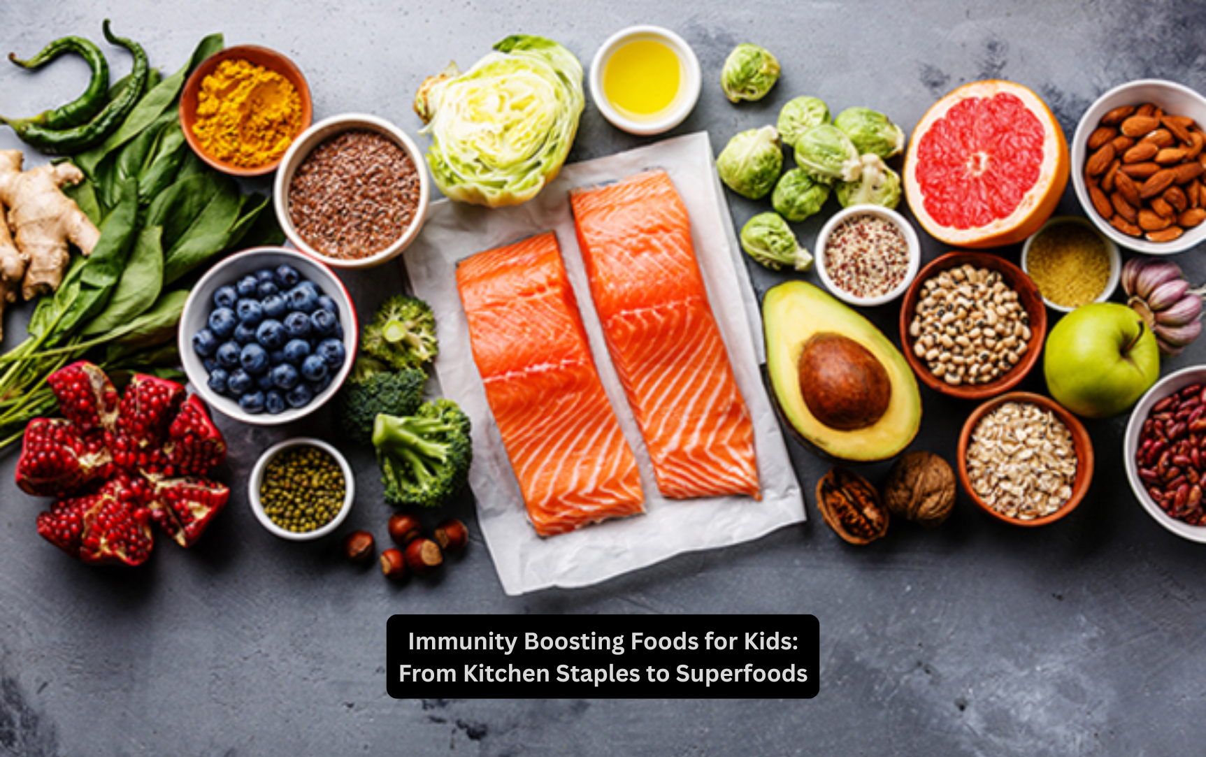 Foods rich in Vitamin C, protein, and antioxidants, such as citrus fruits, nuts, turmeric, and yogurt, help build strong immunity in children.